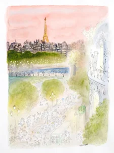 The celebrated cartoonist and New Yorker magazine illustrator, Sempé, was born Jean-Jacques Sempé in the small village of Pessac, in the Gironde départment near Bordeaux, in 1932. Sempé’s work is instantly recognizable. He is known internationally for his whimsical illustrations of countrysides and cityscapes. His watercolor and pen & ink drawings are typically drawn from either a distant or high viewpoint and are often set in a Paris of mansard roofs, French windows, wrought-iron balconies,and Deux Chevaux cars, painterly impressions of a Jacques Tati wonderland. Dwarfed by their surroundings, his figures are generally small men, sometimes balding, stick thin or plump, with big noses and neat little mustaches in the company of small wives, equally thin or plump, who usually match their spouses’ foolishly defeated yet hopeful demeanor. His humor ranges from mildly ironic to riotous, but his love of Paris and Parisians is unmistakable.